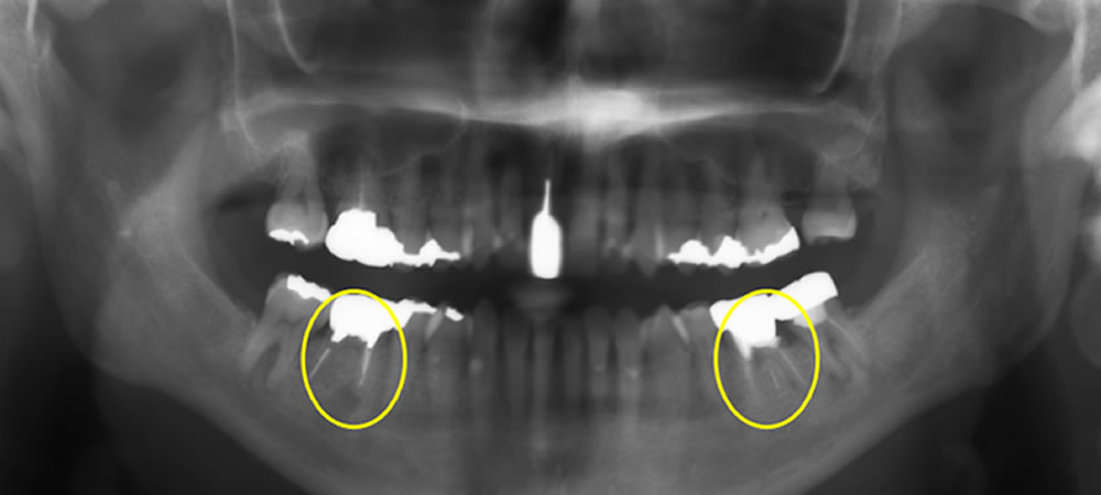 下顎両側の大臼歯を抜歯してインプラントで治療した症例 こちらの患者さまは、右下奥歯が腫れて痛みがあり、食べられないとのことで当院に来院されました。 レントゲン上で右下の6番目の根の先端に大きい影が見られます。また左下も噛 […]